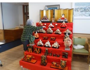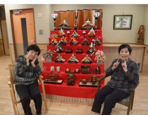 利用者の皆さまと一緒にひな人形を飾る時間は、準備のひとときから楽しみなもの。