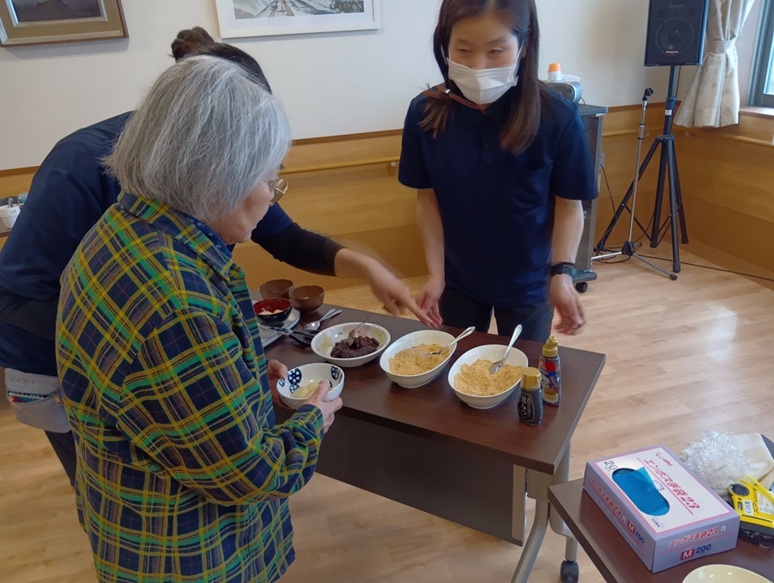 トッピングは黒蜜・きな粉・チョコレートなど、お好きな物を選んでもらい、他、プチロールケーキには生クリームと果物を添えました🍴