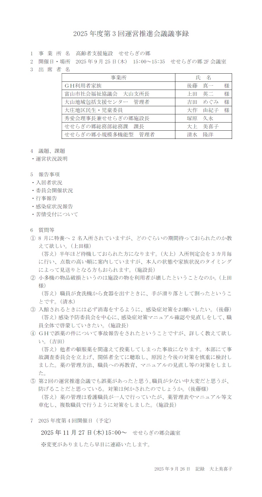 「2025年度 第3回 運営推進会議記録」を公開しました
